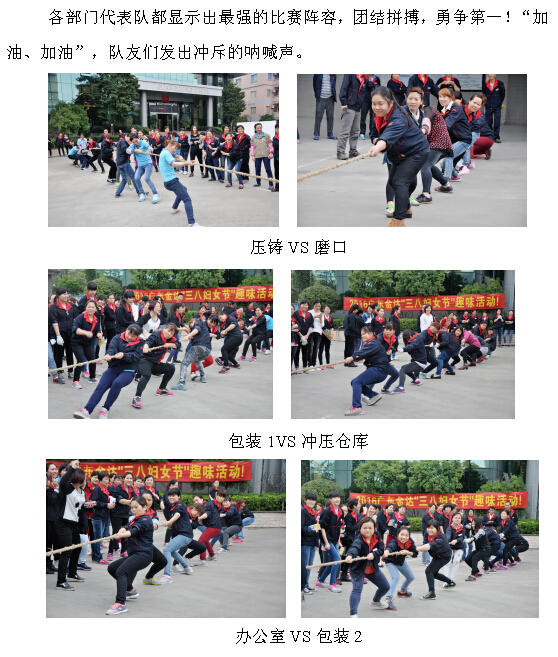 跟隨著現(xiàn)場(chǎng)歡快的音樂(lè),大家放開了工作中忙碌的心情,積極參與各項(xiàng)活動(dòng),玩得不亦樂(lè)乎。其中的拔河項(xiàng)目比賽更為精彩,首先,上場(chǎng)的是經(jīng)理隊(duì)與主任隊(duì)的友誼賽,在這里,我們見到了平時(shí)嚴(yán)威的領(lǐng)導(dǎo)們,也露出了燦爛的笑容。接著,由各部代表組成的6支隊(duì)伍; 包裝1隊(duì)、包裝2隊(duì)、壓鑄隊(duì)、沖壓倉(cāng)庫(kù)隊(duì)、磨口隊(duì)、辦公室隊(duì)進(jìn)行勝負(fù)對(duì)決。參賽的成員個(gè)個(gè)都精神抖擻,隊(duì)友們也在一旁加油吶喊。現(xiàn)場(chǎng)的歡呼聲、吶喊聲,沖斥著整個(gè)活動(dòng)氣氛,包裝2隊(duì)與壓鑄隊(duì)的實(shí)力更是旗鼓不讓,不相上下,場(chǎng)面相當(dāng)激烈。最后,冠軍由現(xiàn)場(chǎng)人氣最強(qiáng)的包裝2隊(duì)取得。